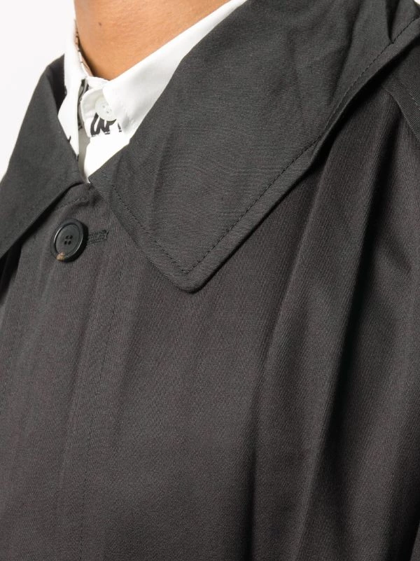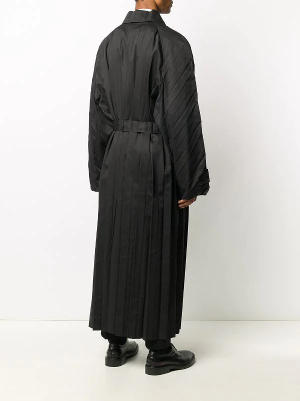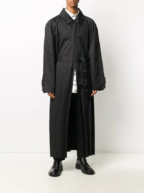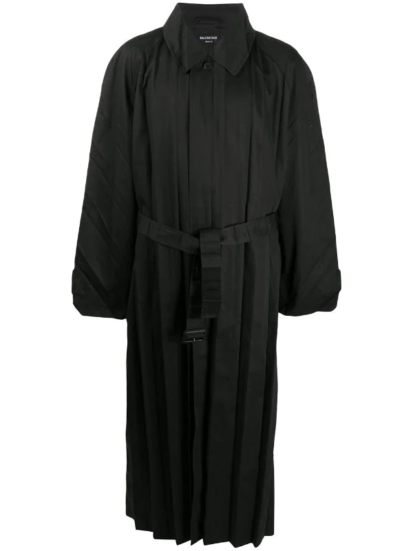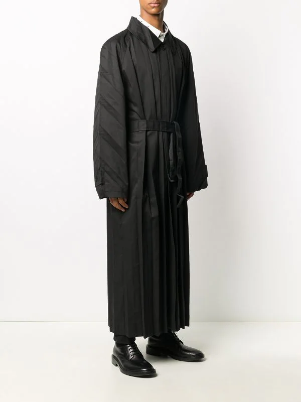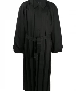 Design plissé, col classique, fermeture dissimulée sur le devant, manches raglan longues, taille ceinturée, longueur cheville. Couleur : noir.
