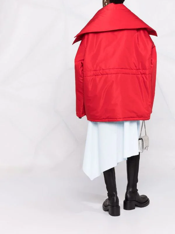 Col long, épaules tombantes, fermeture à boutons pression sur le devant, ceinture élastique, manches longues, deux poches à rabat sur le devant. Couleur : rouge.