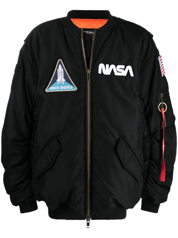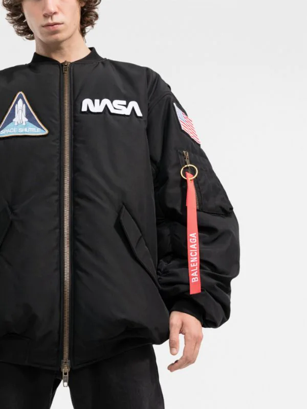 Détail de patch, fermeture zippée devant, manches longues, deux poches latérales à rabat. Couleur : noir.