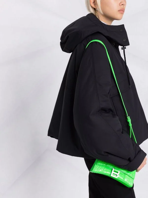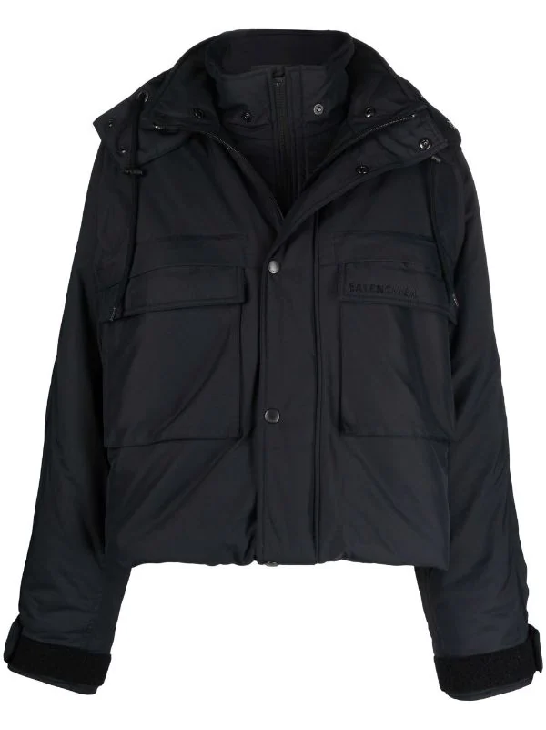 Capuche à lien de resserrage, fermeture à zip et boutons sur le devant, manches longues, deux poches à rabat sur le devant. Couleur : noir.