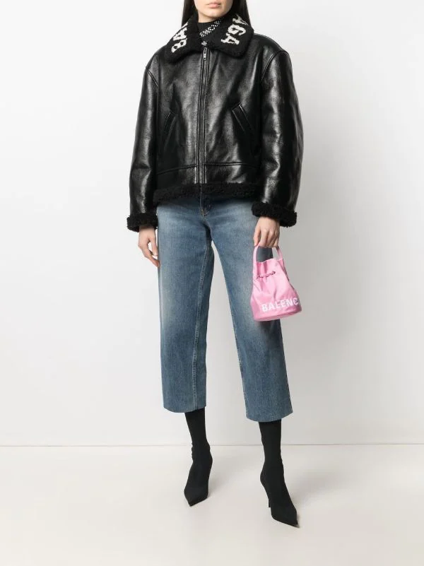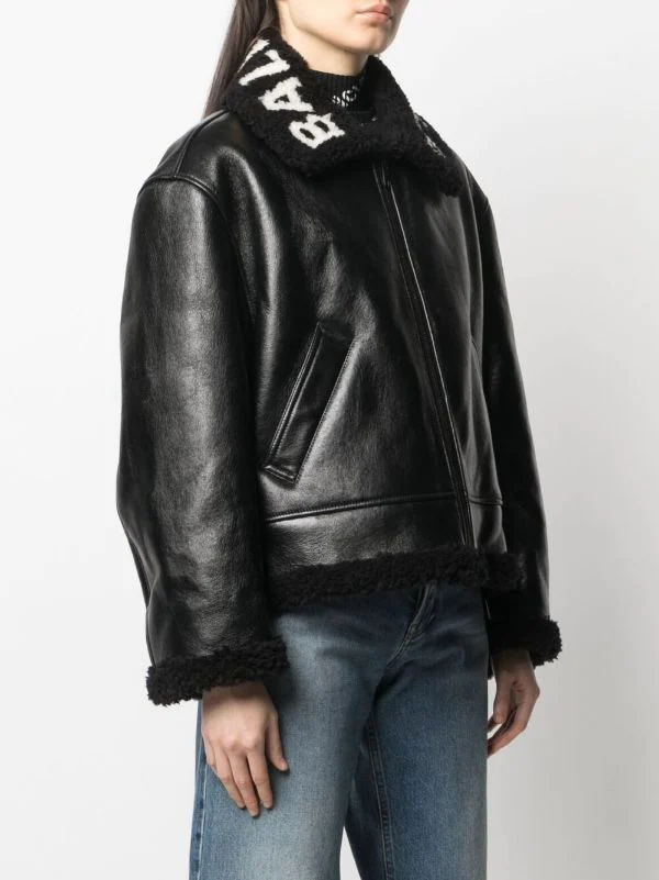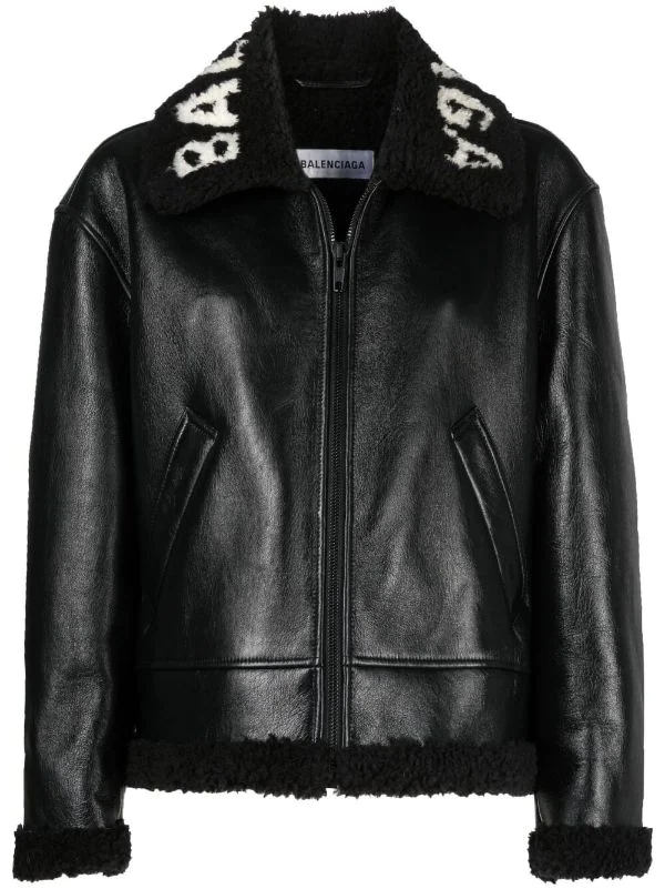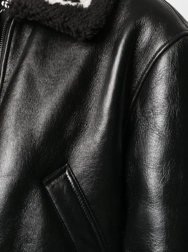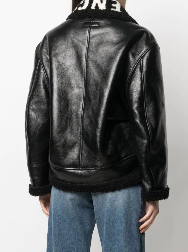 Doublure en mouton retourné, logo brodé sur le col, col classique, fermeture zippée devant, manches longues, deux poches latérales passepoilées, ourlet droit. Couleur : noir. Matière : peau d’agneau.